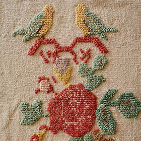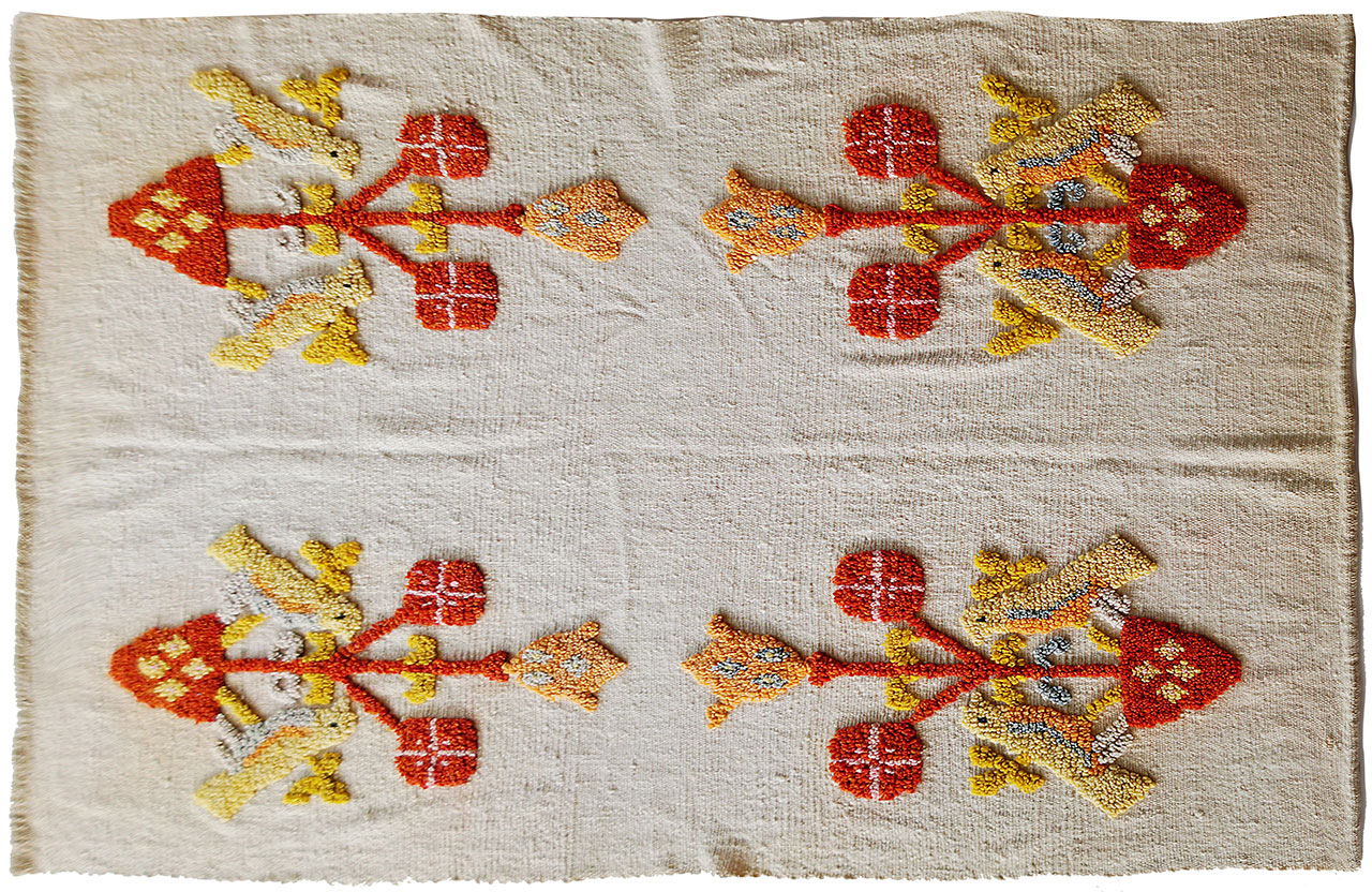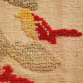 Técnica:Urdimbre y trama, una hebra / Pelo doble / Diseño floral y pájaros / Cosida en la terminación