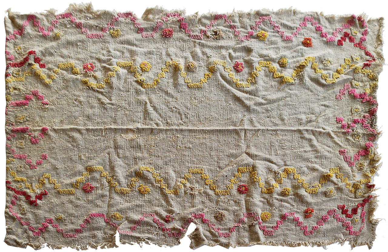 Técnica:Urdimbre y trama, una hebra /Brocado/ Diseño floral y letras / Cosida en la terminación